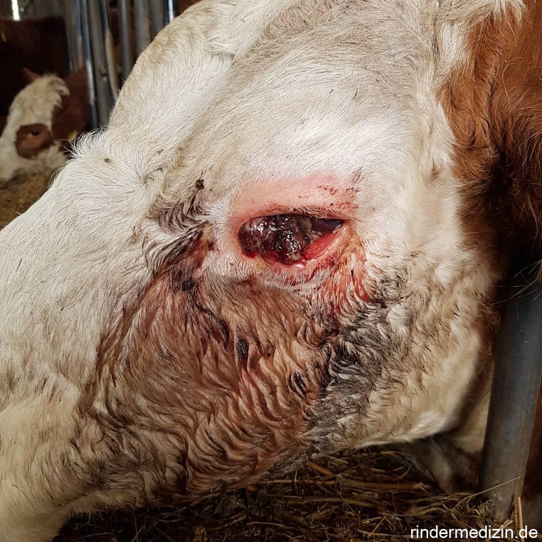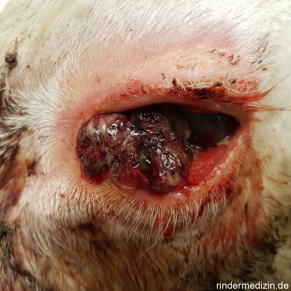 Normalerweise wird sie als Mutterkuh extensiv auf der Weide gehalten. Dort fiel sie mit dieser Zubildung am Auge und übelriechender Sekretion aus dieser auf und wurde daraufhin eingestallt und Dr. Sabine vorgestellt. Diese Art von Tumor tritt vor allem bei Rassen auf die im Bereich der Augen unpigmentiert sind (besonders bei Hereford und Fleckvieh). Die Entstehung wird durch chron. UV-Strahlung, sprich Sonnenlicht, begünstigt.