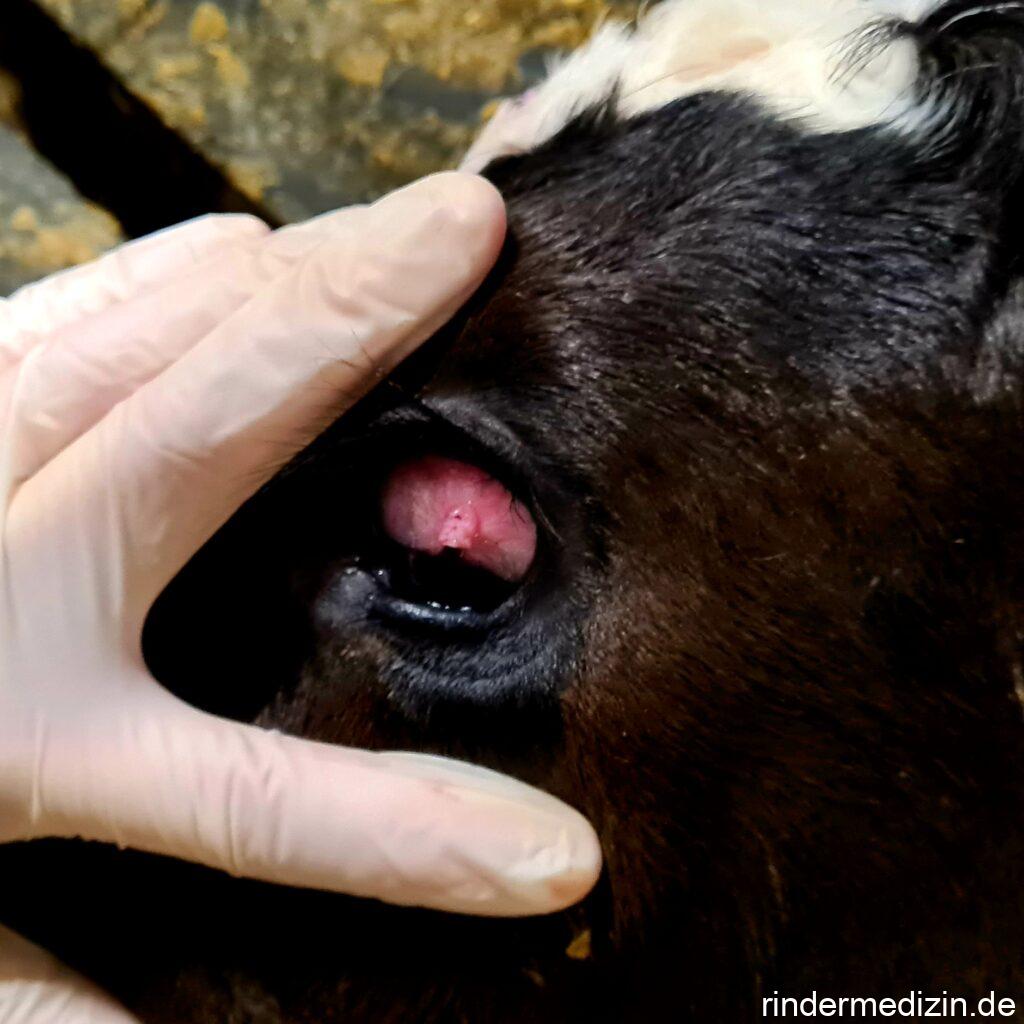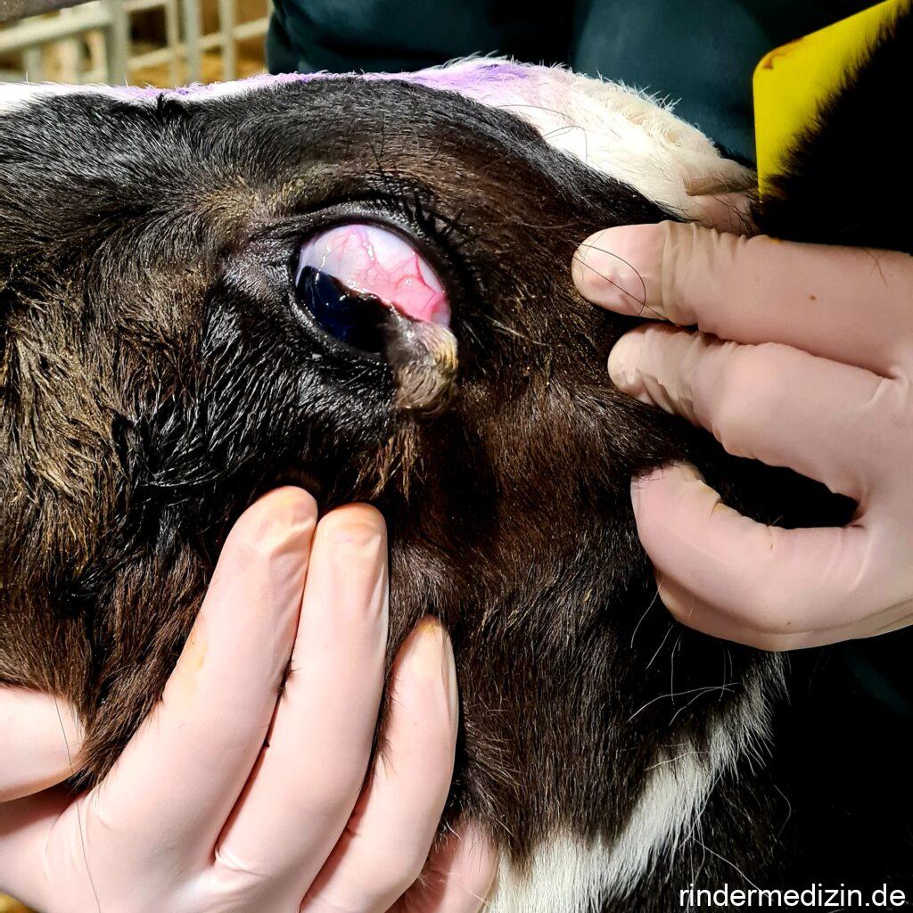 Heute zeigen wir ein Bindehautdermoid bei einem Kalb. Bei einem Dermoid handelt es sich um einen (meist) gutartigen Tumor, der schon bei Geburt vorhanden ist. Man sagt dazu gerne „versprengte Hautinsel“. Diese Missbildung kommt insbesondere beim Hereford-Rind vor, wurde aber auch schon bei vielen anderen Rinderrassen beschrieben. Die Ursache ist nicht unbedingt für alle Dermoide klar, beim Hereford-Rind soll es aber genetisch sein. Ein Zusammenhang mit Vitamin-A-Mangel wird vermutet.
