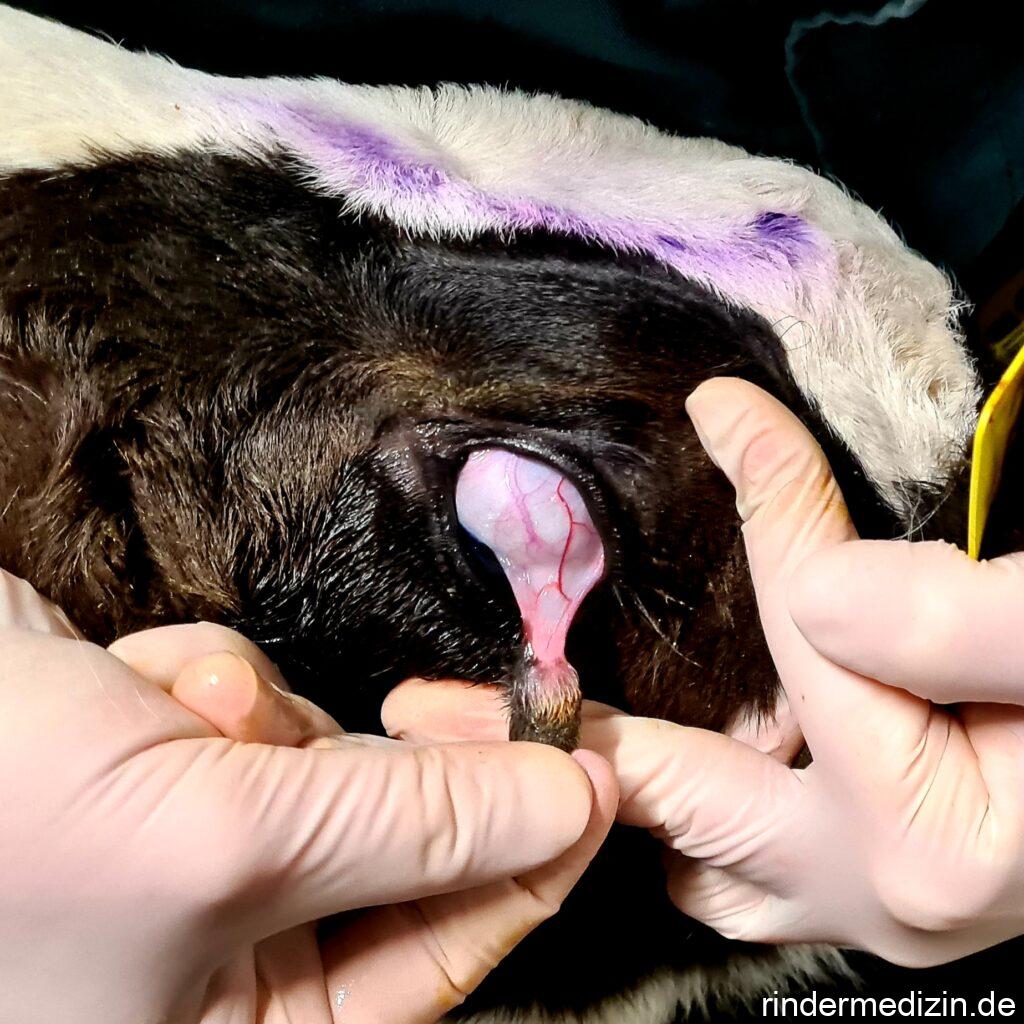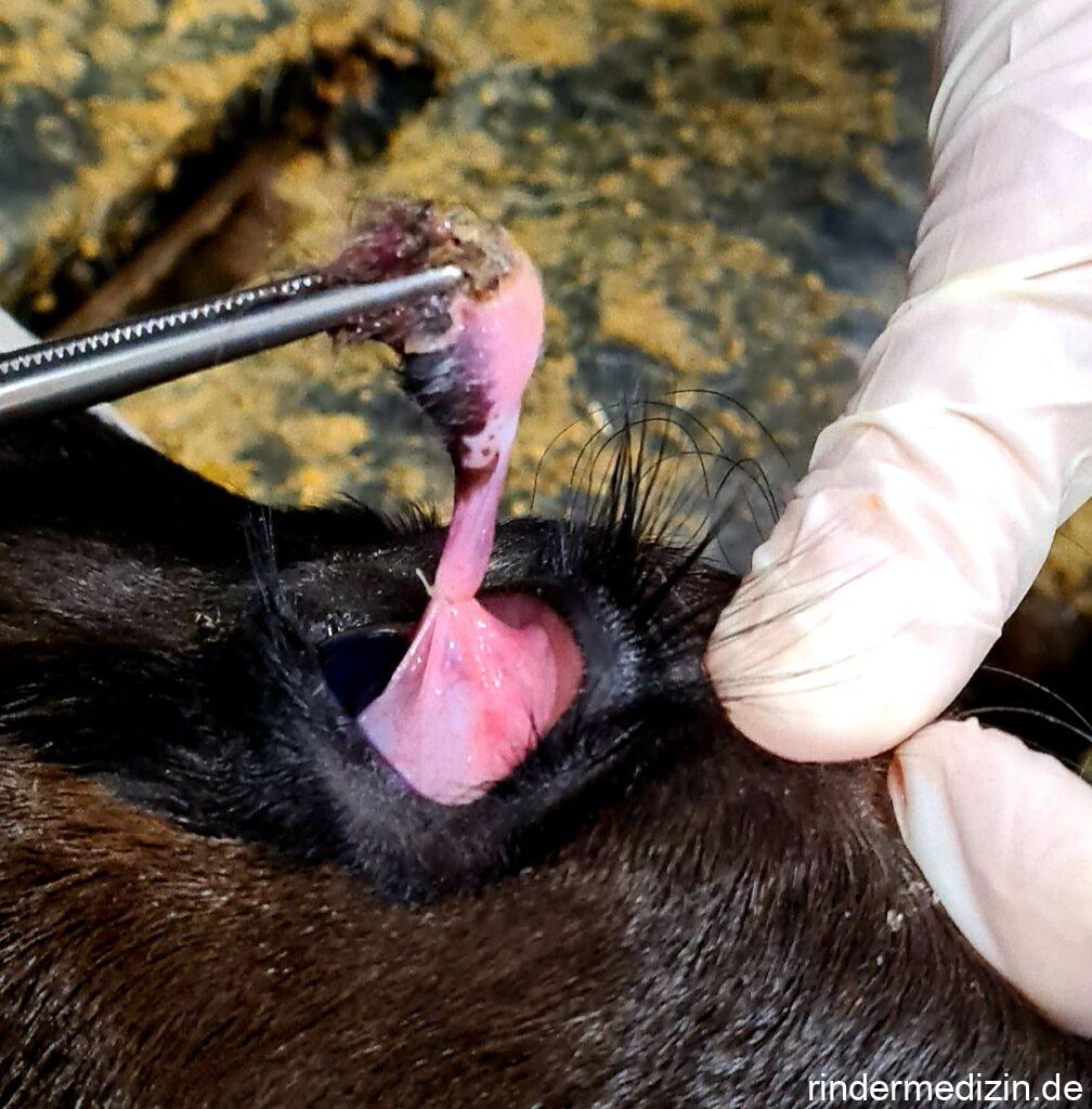 Das Kalb wurde in Narkose gelegt, das Dermoid mit einer Klemme angehoben und mit dünnem resorbierbarem Faden abgebunden. Ein Schnitt und das war dann auch schon die Augenoperation.