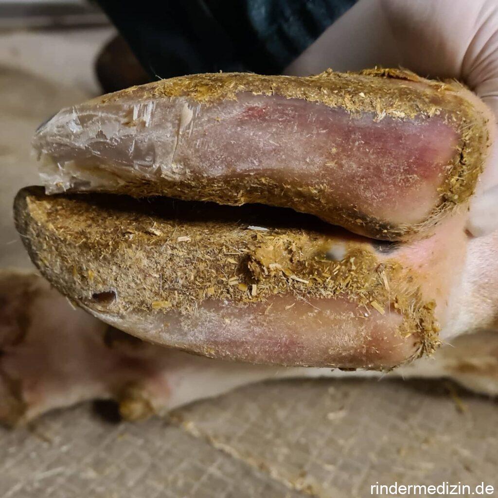 Heute seht ihr auf den Bildern einen Jungbullen mit „typischer“ Sägebockartiger Stellung: vorgestreckte Vorderbeine und aufgekrümmter Rücken. Auf dem Foto mit der Klaue seht ihr, wieso das so ist. Das Rind hat Rehe. Ja, nicht nur ein Pferdetierarzt behandelt Rehe, auch in der Rindermedizin kann man auf Klauenrehe treffen. Man nennt diese Erkrankung auch Laminitis oder Pododermatitis aseptica diffusa. Es sind also die Klauen (bzw. die Lederhaut) entzündet, aber nicht aufgrund von Bakterien. Am Anfang des ganzen steht die Lockerung des Aufhängeapparates und es kommt zum Absenken des Klauenbeins. Im Anschluss entsteht Druck auf die Klauenlederhaut und sie wird geschädigt. Nach ein paar Wochen kann man rötliche Verfärbungen im Sohlenbereich der Klauen beobachten, die von Einblutungen stammen.