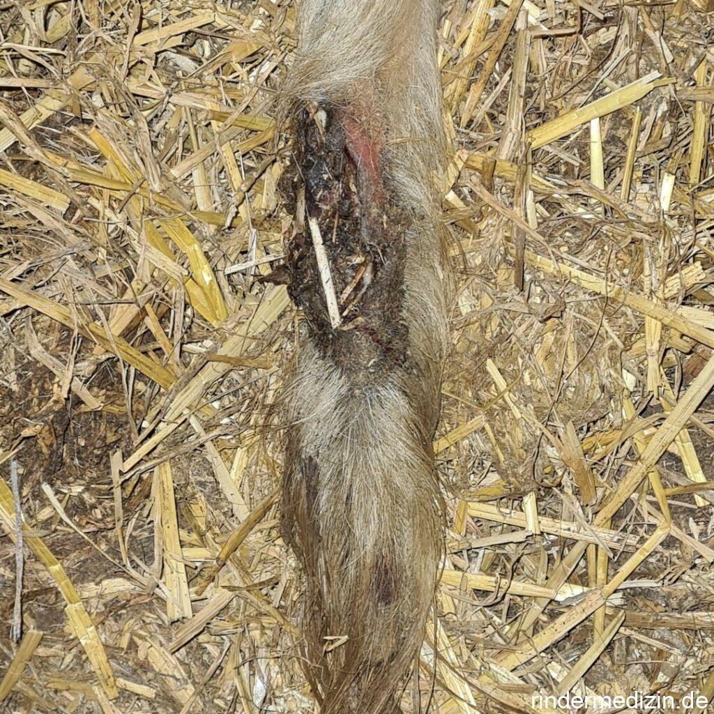 In leichten Fällen kann man mit Antibiose und Schmerzmittel noch etwas erreichen, aber so früh werden einem die Bullen selten vorgestellt. Meistens muss man den entzündeten Schwanz amputieren, denn die Eitererreger können sonst ins Rückenmark aufsteigen und zum Festliegen führen oder sich in den Gelenken ansiedeln und dort eine Arthritis auslösen. Die „Amputation“ mit Gummiringen ist zum einen verboten und zum anderen können die Bakterien den Gummiring unterwandern. Man muss also chirurgisch amputieren.