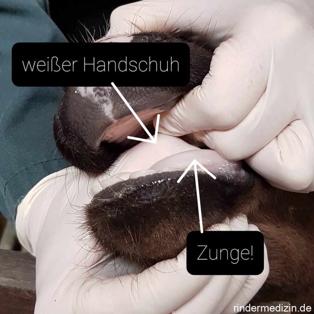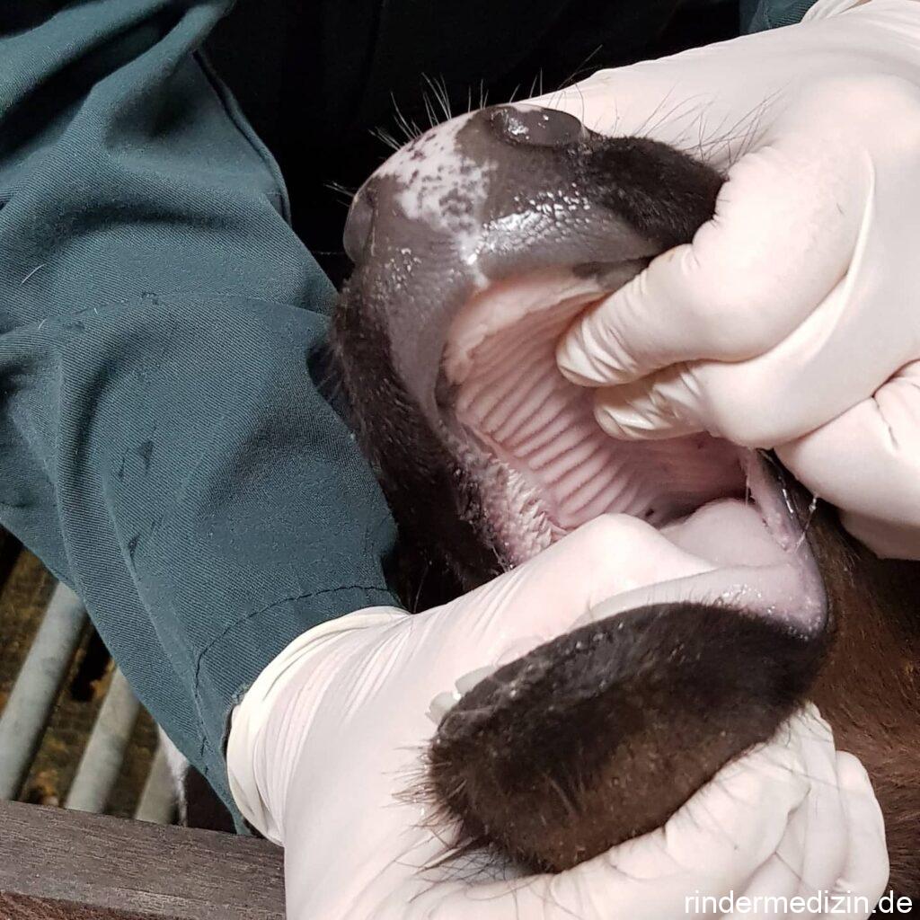 Ein wichtiges Kriterium ist die Farbe der Maulschleimhaut, bei einem gesunden Kalb ist sie rosa. Bei Eisenmangel ist sie hingegen blass. Das seht ihr auch auf den Fotos. Das Kalb auf den Fotos hat fast weiße Schleimhäute und eine fast weiße Zunge. Die kapilläre Füllungszeit ist hingegen nicht beeinträchtigt, falls man sie überhaupt beurteilen kann. Die Episkleralgefäße (am Auge) sind oft blutarm und deren Umrisse nur undeutlich zu erkennen.