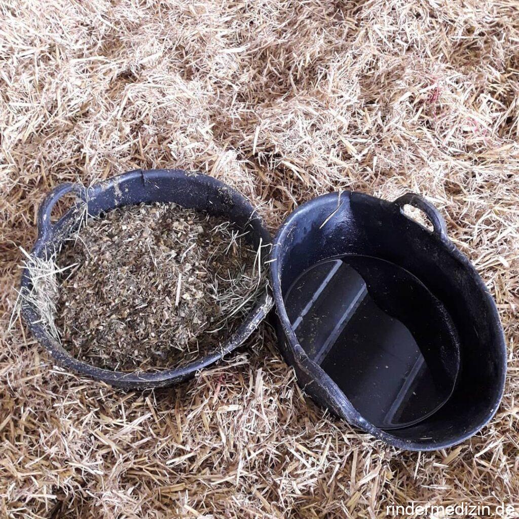 Stetes Vorhandensein von Futter und Wasser in erreichbarer Nähe (Hunger und Durst sind keine tiergerechte Aufstehmotivation). Auf dem 2. Bild seht ihr flexible Gummitröge, die nicht kaputt gehen können, wenn die Kuh sich darauflegt.