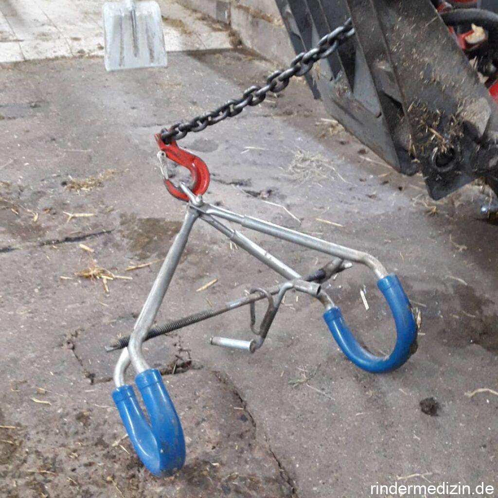 Daher ist es wichtig Aufhebeversuche zu machen (so selten wie möglich, so oft wie nötig). Dies erfolgt häufig mit der Beckenklammer. Zu diesem Hilfsmittel haben wir ein gespaltenes Verhältnis. Man sollte immer Bedenken, dass man die Kuh mit ihrem ganzen Körpergewicht (650-800kg) daran aufhängt. Das kann für das Tier sehr unangenehm sein und führt bei zu häufiger Benutzung zu großflächigen Einblutungen in die Muskulatur und starker Schwellung an den Hüfthöckern. Keinesfalls darf man die Kühe darin länger hängenlassen.