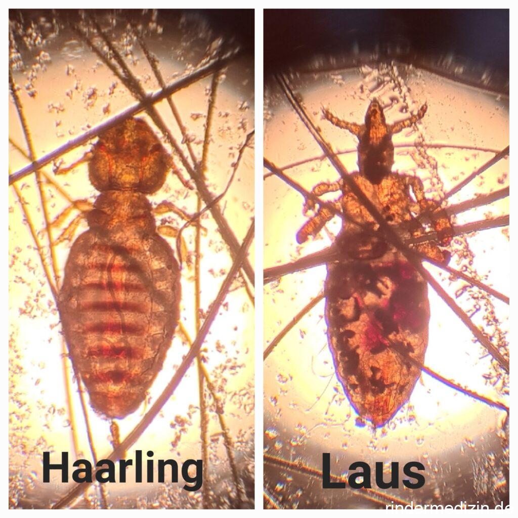 Haarlinge sind flügellose Insekten. Sie sind nah verwandt mit den Federlingen. Man kann sie aber einfach unterscheiden. Haarlinge gibt es bei Säugetieren (die haben ja auch Haare). Federlinge gibt es bei Vögeln (Überraschung, die haben Federn). Schwieriger wird es dann schon beim Rind die verschiedenen Parasiten der Haut zu unterscheiden. Milben kann man mit dem bloßen Auge nicht sehen, dafür benötigt man ein Mikroskop. Haarlinge hingegen sind 1,2 – 1,5 mm lang, auch Läuse und Flöhe sieht man mit dem bloßen Auge. Flöhe können springen, unter dem Mikroskop erkennt man die Sprungbeine. Flöhe sind extrem selten bei Rindern. In tropischen Gebieten kann aber der Sandfloh (Tunga penetrans) Rinder befallen.