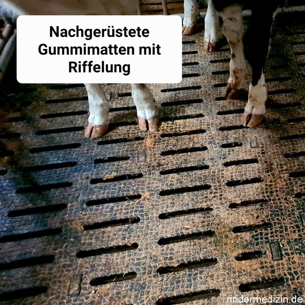 Die grünen Kunststoffroste wird es bald nicht mehr geben, da ist uns auch kein System zur Nachrüstung einer Gummiauflage bekannt. Auf dem Kunststoffboden sind Kälber meist sehr sauber, aber er ist laut wenn die Kälber darauf rennen.