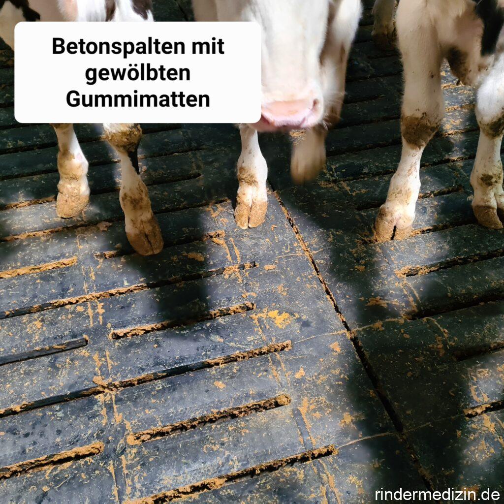 Es gibt diverse Gummiauflagen für Bongossi-Spaltenböden zu kaufen, so dass die vorhanden Spalten weiter genutzt werden können. Die Schlitze sind dann etwas schmaler, das führt zu etwas dreckigeren Kälbern. Bei einer kompletten Erneuerung des Boden kann man durch breitere Spalten erreichen, dass die Kälber sauberer sind. Teilweise sind die Gummiauflagen auch gewölbt, damit Kot und Urin besser abfließt oder es gibt eine Riffelung, die dafür sorgt, dass die Kälber nicht rutschen. Wer bisher nur Kälber auf Bongossi-Spalten kannte, der wird sich wundern wie die Kälber sich auf Gummi verhalten. Sie finden es offensichtlich deutlich bequemer auf Gummi zu liegen und verhalten sich etwa wie Kälber auf (gutem) Stroh. Zudem sind Kälber auf Gummi mobiler, sie können dort besser laufen. Bei einem neu gebauten Stall kann man statt der Tropenholzspalten auch Betonspalten mit Gummiauflage einbauen.