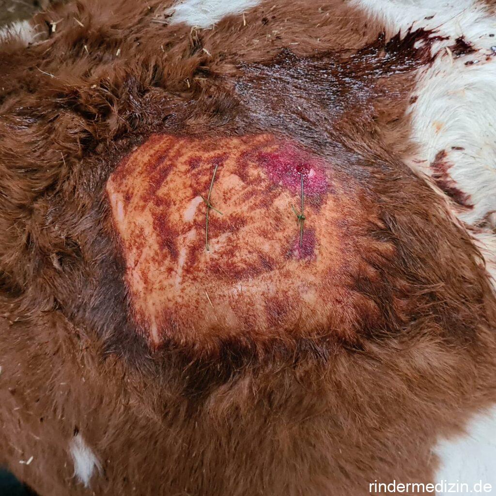 Bei der Pansenfistel wird ein Loch in das Kalb operiert, damit der Pansen nach außen abgasen kann. Im Grunde ist die Sache ganz einfach: Man macht in die äußere Haut ein Loch, ob es schlitzförmig oder rund ist, ist egal. Dann arbeitet man sich zum Pansen vor und macht da auch ein Loch rein. Beide Löcher werden nun zusammengenäht. Das sich im Rahmen einer Pansentympanie bildende Gas kann nun einfach nach außen abgehen. Wichtig dabei ist: immer auf der linken Körperseite arbeiten. Von der anderen Seite kann man sich bestimmt auch irgendwie zum Pansen vorarbeiten, aber der Weg wäre zu lang, um den Pansen mit der äußeren Haut zu vernähen. Es gibt Rinderärzte, die machen das mit örtlicher Betäubung mit stehendem Kalb. Man kann es aber auch mit einem Kalb in Vollnarkose machen, das hat den Vorteil, dass das Gewebe nicht durch das injizierte Lokalanästhetikum verändert ist.