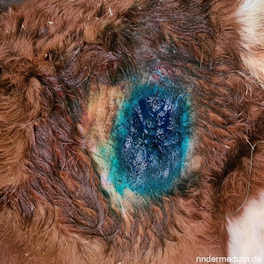 Auf dem letzten Bild seht ihr das Kalb fünf Tage nach der Operation. Es frisst wieder ganz wunderbar, was es mit seinem vorher aufgegastem Pansen nicht mehr getan hatte. Schmerzäußerungen, wie zum Beispiel Zähneknirschen, zeigt es nicht. Was allerdings auffällt: Da läuft ganz schön viel Panseninhalt aus dem Loch raus. Beim stehenden Tier nicht, aber so ein Fresser steht ja nicht immer. Das ist natürlich nicht ganz unproblematisch, daher sollten solche Tiere dann regelmäßig gereinigt werden, damit sich die Haut nicht entzündet.