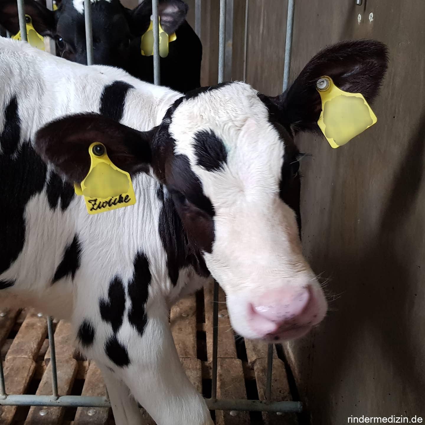Heute steht bei diesem Kalb mal ausnahmsweise kein Name auf der Ohrmarke, sondern eine Diagnose: Zwicke. Was bedeutet das? Dieses Kalb sieht wie ein Weibchen aus, ist aber (vielleicht) nicht zu 100 % ein Weibchen. Das was man landläufig als Zwicke bezeichnet ist ein Kalb mit Freemartinismus. Eine Zwicke kann entstehen bei Mehrlingsträchtigkeit|en, also wenn mehr als ein Kalb hinten aus der Kuh fällt. Eine weitere Bedingung dafür: das zweite Kalb ist nicht auch weiblich, sondern männlich. Dann können nämlich im Mutterkuchen Verbindungen zwischen den beiden Kälbern entstehen und das Blut munter von einem Kalb in das andere Kalb hin und her tauschen. Es entstehen Chimären (XX/XY). Erstmal nicht schlimm, aber es wandern dann auch die Hormone Testosteron und Anti-Müller (ein Hormon welches während der Entwicklung des Kalbes dafür sorgt, dass ein Männchen auch männliche Geschlechtsorgane hat. Beim weiblichen Fötus kommt es nicht vor, dann entwickeln sich weibliche Geschlechtsorgane.) vom Bullenkalb in das weibliche Kalb. Diese Hormone sorgen dann dafür, dass sich kein richtiges Weibchen entwickelt, sondern nur ein Kalb das auf den ersten Blick wie ein Weibchen aussieht. Die Geschlechtsorgane des weiblichen Kalbes sind aber unterentwickelt. Solche Zwicken sind daher in der Regel nicht fruchtbar und dementsprechend nicht als Milchkuh nutzbar, sondern nur als Mastrind.