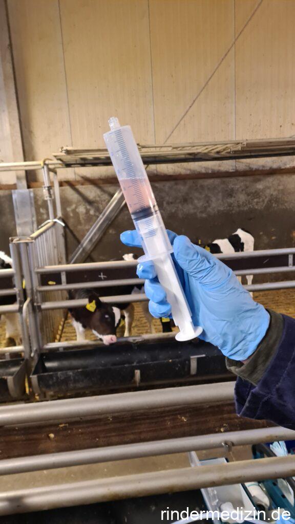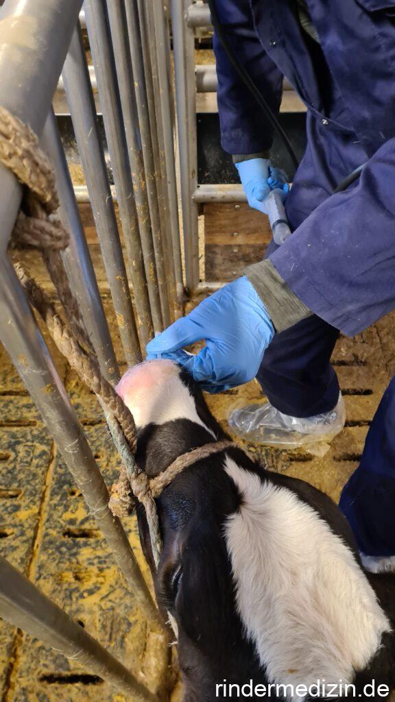 Wird die Spülung durch die Nase vorgenommen, so ist der Aufwand etwas geringer, aber es besteht die Gefahr der Kontamination der Probe mit Erregern aus dem oberen Atemtrakt. Zudem wird weniger Material benötigt. Das Rind wird für die Probennahme fixiert, die Nase und der Naseneingang gründlich desinfiziert.