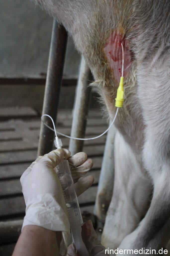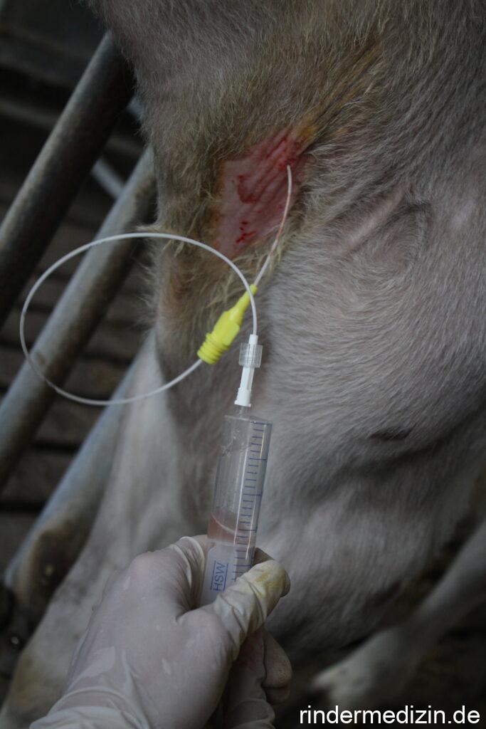 Das, was hier beschrieben wurde, ist die sogenannte blinde Lungenspülung, da ohne Sichtkontrolle gearbeitet wird. Wichtig ist, dass das Tier sehr gut fixiert wird. Der Nachteil dieser Diagnostikmethode ist der relative hohe Aufwand und die größere Belastung für das Tier im Vergleich zum Nasentupfer.
