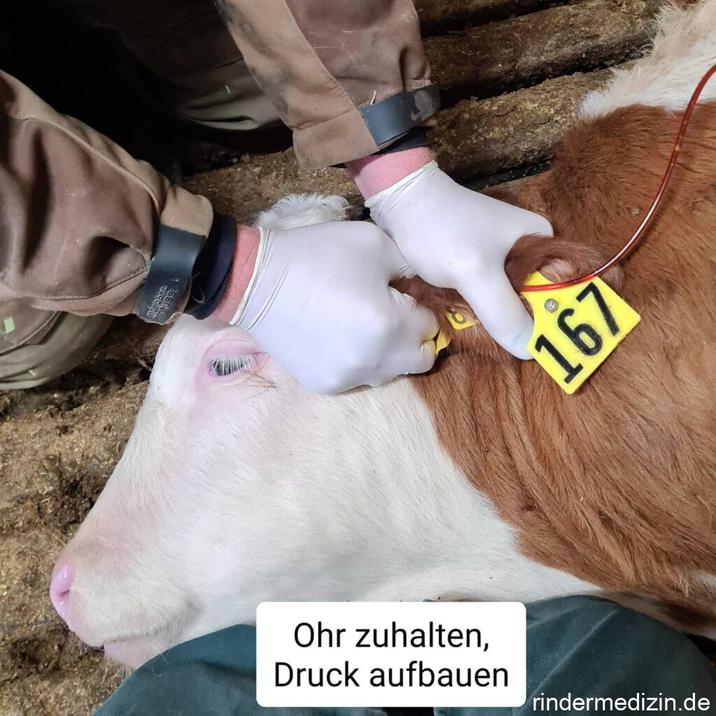 Vor ein paar Wochen haben wir uns ja schon einmal mit dem Thema Hängeohr befasst. Eine Mittelohrentzündung kann für den Kälbertierarzt eine undankbare Sache sein. Manchmal nützt das ganze spritzen nichts, das Ohr bleibt einfach hängen. Dann muss man sich etwas neues überlegen. Wir nehmen dann eine Ohrenspülung vor.