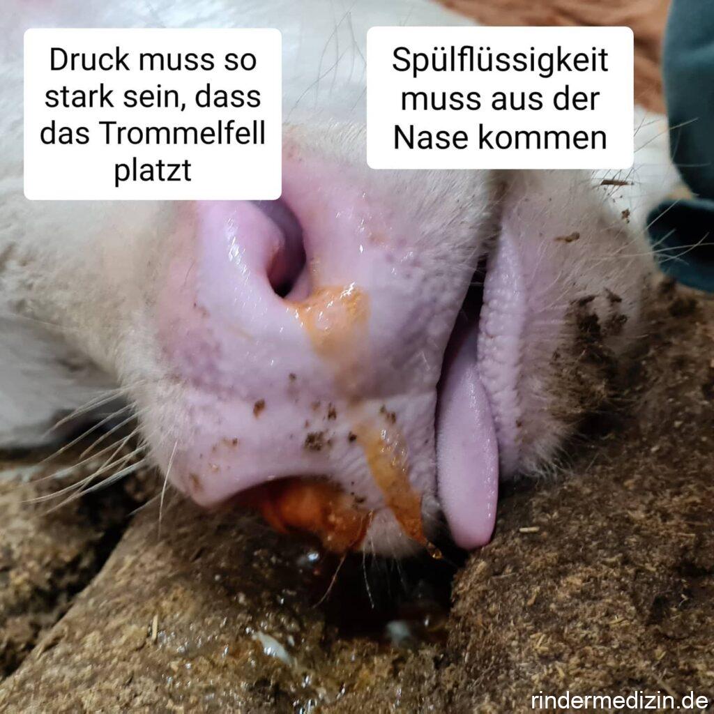 Nun benötigt man eine große Spritze mit 2%iger PVP-Jod-Lösung und einer Heidelberger Verlängerung (ein Schlauch den man an die Spritze anschließen kann). Am freien Ende der Heidelberger Verlängerung wird der Platikanschluss entfernt, so dass man ein einfaches Schlauchende hat. Den Schlauch steckt man in das Ohr möglichst tief rein. Dann hält der Landwirt*in das Ohr mit beiden Händen fest zu. Mit der Jodlösung wird dann soviel Druck aufgebaut, dass das Trommelfell platzt. Die Jodlösung kommt dann aus der Nase heraus (Äußeres Ohr => Mittelohr => Eustachische Röhre => Nasen-Rachen-Raum => Nase). Man zerstört also bei dieser Aktion das Trommelfell. Wer selbst schon einmal eine Mittelohrentzündung hatte weiß wie unangenehm der Druck auf dem Trommelfell ist und wie befreiend es ist wenn es platzt. Zudem kann dann der Eiter in den nächsten Tagen gut ablaufen. Vorteil Nummero Drei: Man hat mit einer desinfizierenden Lösung da mal den Dreck rausgespült.