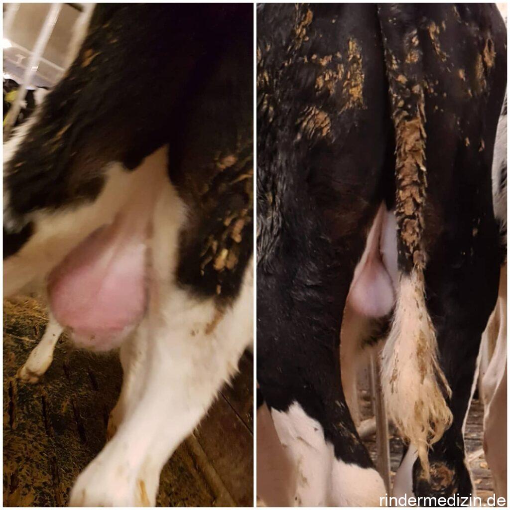Die Hoden sind angeschwollen und dadurch größer, zudem sind sie gerötet und warm. Wenn man die Hoden zur Untersuchung anfasst, dann treten die Kälber. Offenbar tut das weh. Manchmal zeigen solche Kälber Fressunlust.