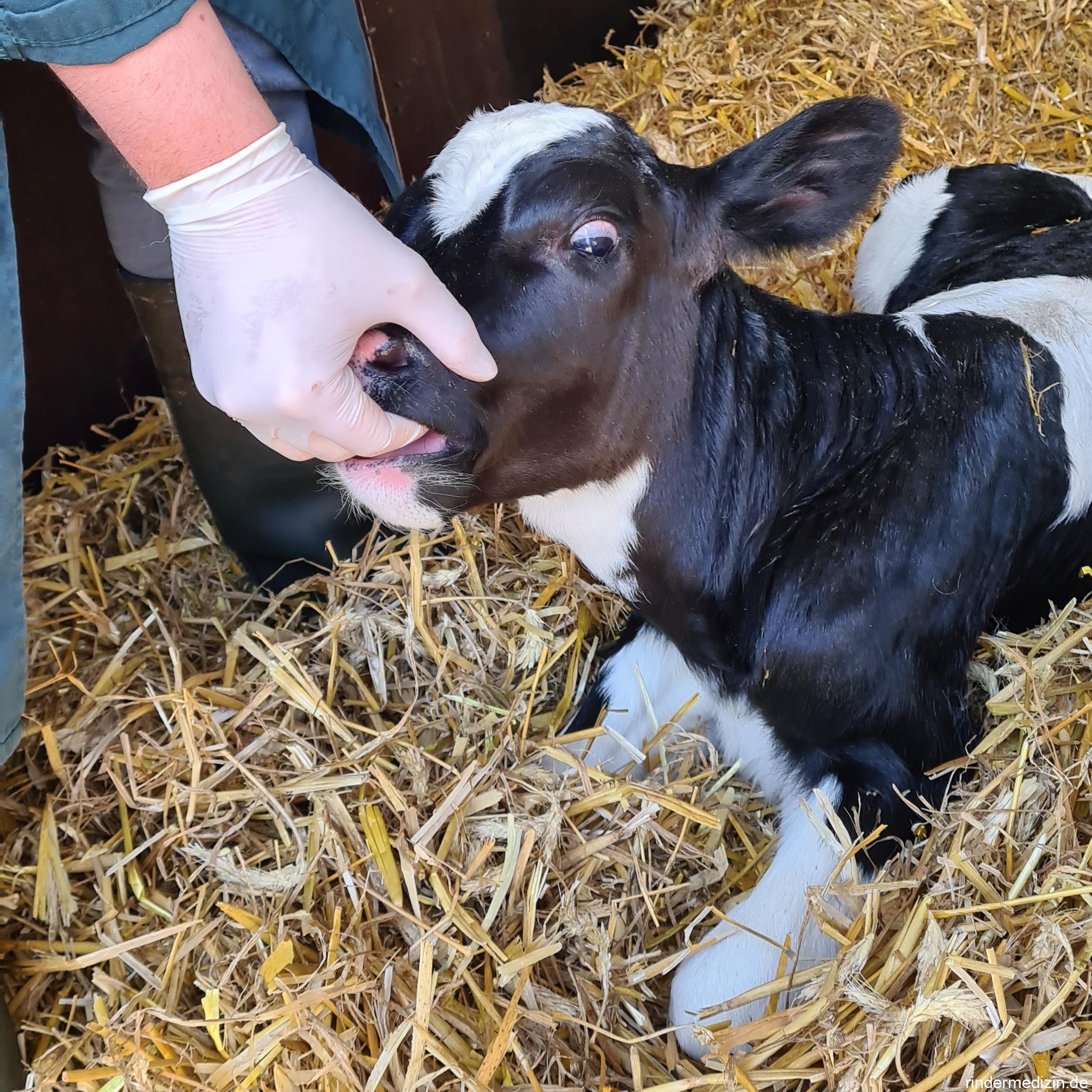 Um den Saugreflex zu prüfen führt man einen Finger in das Maul des Kalbes ein. Ein gesundes Kalb umschließt mit der Zunge den Finger und fängt an zu saugen. Es ist erstaunlich wie kräftig der Sog sein kann. Hat man den Finger schon einmal im Maul, kann man auch gleich schauen ob es Veränderungen im Maul (z. B. Entzündung der Maulschleimhaut oder Zunge) oder einen Fremdkörper gibt.