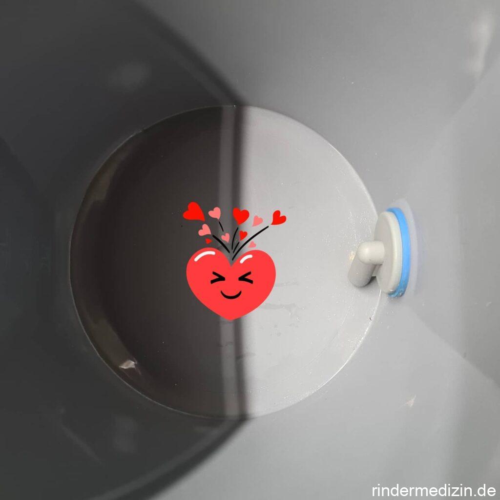 Nach der Milchtränkung und anschließenden Reinigung kann man den Kälbern in so einem sauberen Eimer auch ganz wunderbar Wasser anbieten. Das billigste Futtermittel der Welt! Habe noch nie Probleme mit einem Kalb gehabt weil es Wasser aus dem Nuckeleimer hatte. Ich denke immer, Wasser in den Nuckeleimer füllen, findet mit ein bisschen Glück statt. Wasser aus einer anderen, wenn möglich auch noch sauberen, Tränkemöglichkeit anbieten, ist eher unwahrscheinlich