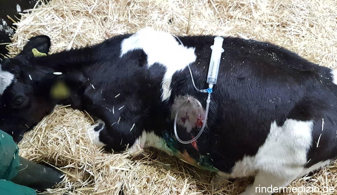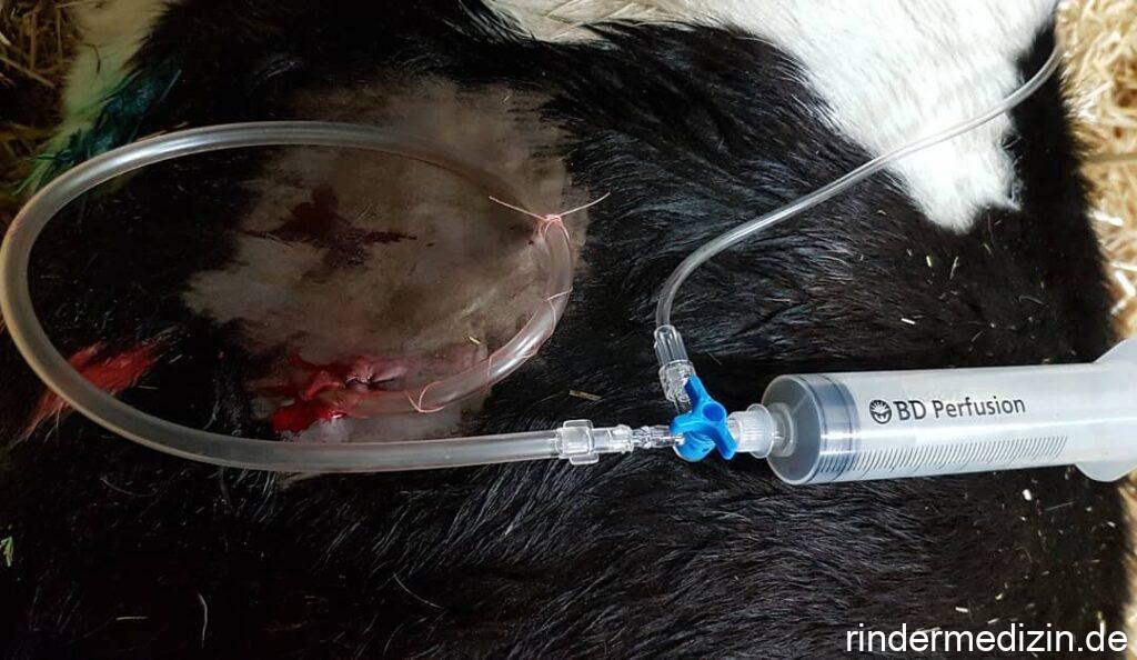 Man verschließt die vorhandenen Wunden chirurgisch und legt einen Schlauch mit angeschlossenem 3-Wege-Hahn, eine Thoraxdrainage, in den Brustkorb. Mit der aufgesetzten Spritze (siehe Bilder) kann man dann die eingedrungene Luft aus dem Brustkorb entfernen – sprich erneut Unterdruck aufbauen. So entfaltet sich die Lunge wieder, das Kalb kann besser atmen.