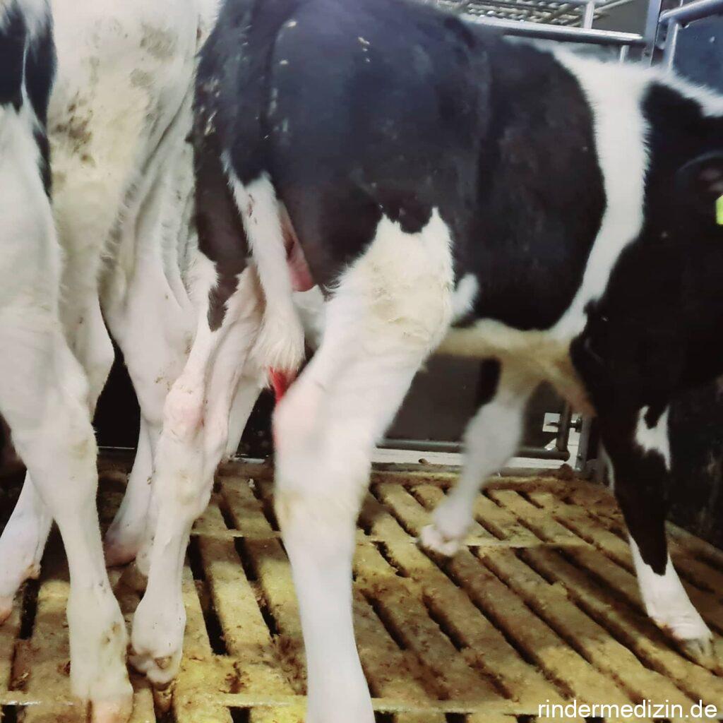 Auf dem ersten Bild seht ihr ein paar Kälber in einer Reihe stehen. Was fällt auf? Ein Kalb hat eine durch Blut eingefärbte rote Schwanzspitze. Die anderen Kälber haben ihren Schwanz zwischen die Beine geklemmt. Warum? Ein Buchtengenosse ist offenbar ein sogenannter Schwanzbeißer. Das kennt man ja eigentlich nur vom Mastschwein. Wobei das beim Kalb nicht immer ein wirklicher Beißer ist, sondern oft ein Schwanzsauger, oder es wird zusätzlich ein bisschen drauf herum gekaut.